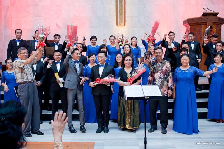 Atmosfir di dalam gereja malam itu terasa sangat hidup. Sorot lampu hijau yang menyinari latar belakang altar memberikan kesan teatrikal yang pas, menonjolkan kekhidmatan sekaligus kemeriahan acara. Momen pemberian apresiasi berupa buket bunga kepada para dirigen dan pelatih menjadi salah satu kepingan emosi yang paling hangat. Ada rasa bangga dan lega yang terpancar, menandakan bahwa kerja keras latihan selama berbulan-bulan mulai menampakkan hasilnya.